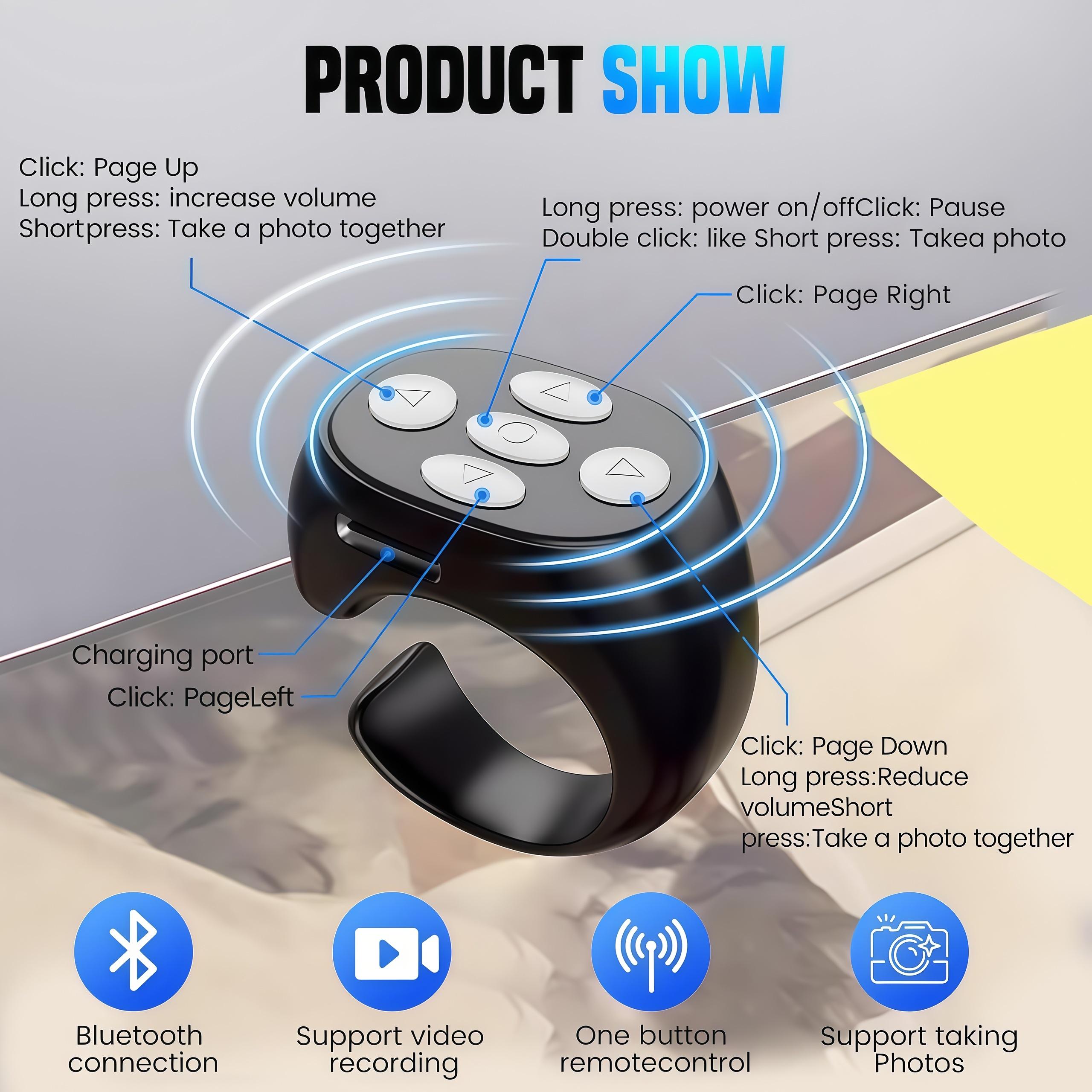 - 【Bluetooth Page Turner】This bluetooth ring can also be used to turn pages in the e-book app. It gives readers the convenience of a hands-free page-turning experience, allowing them to avoid touching the screen, particularly useful in colder months when reading in bed. Simply press a button to turn the page, making it a perfect gift for book lovers and an essential accessory for e-book readers.